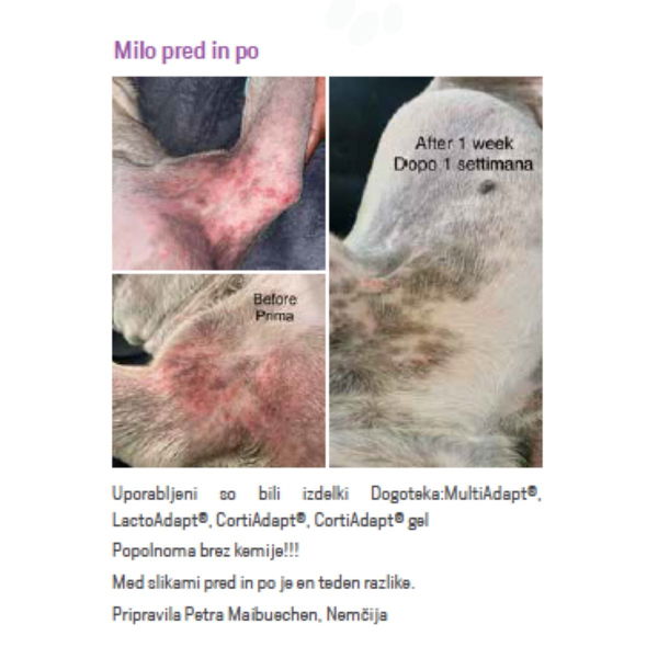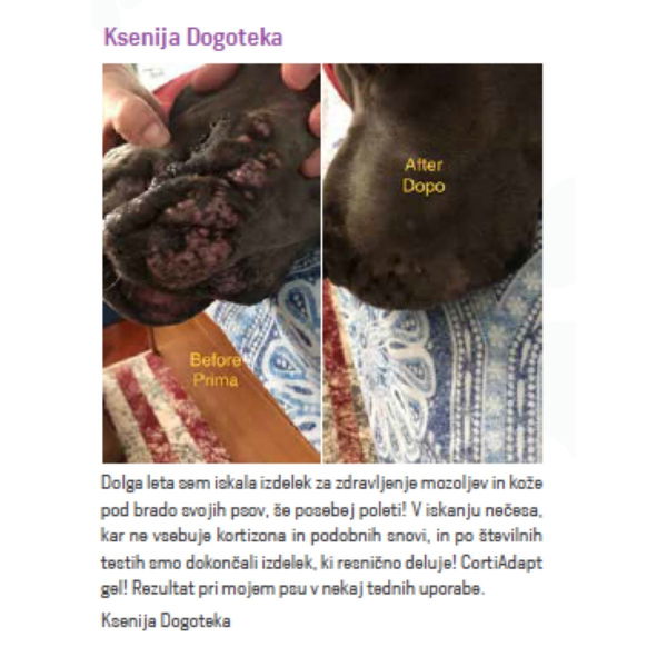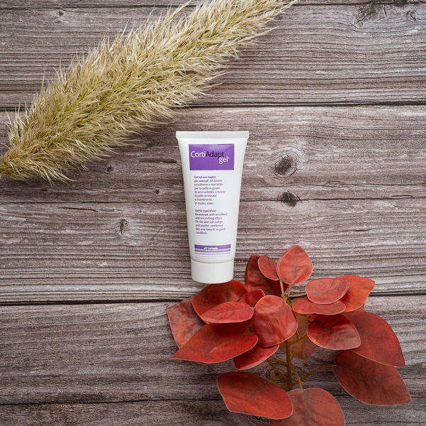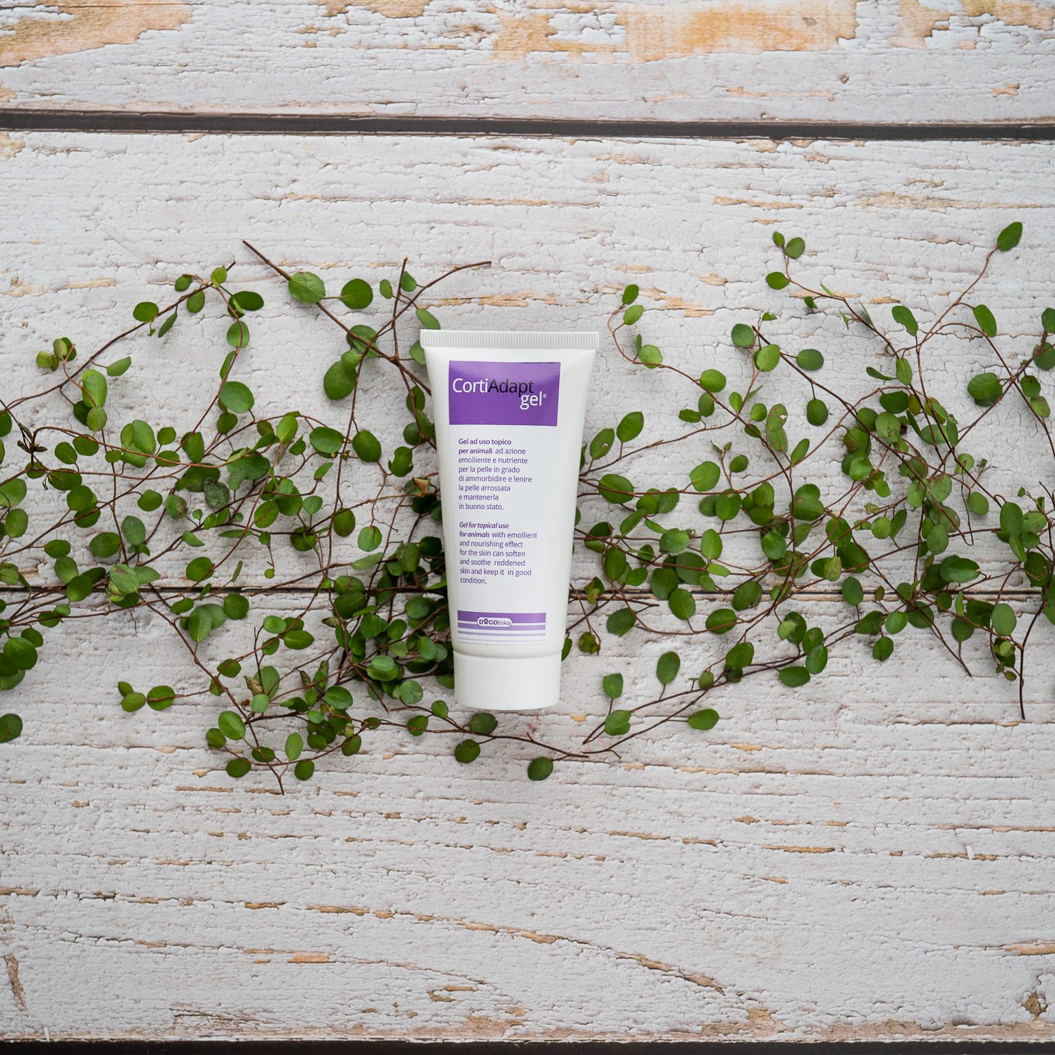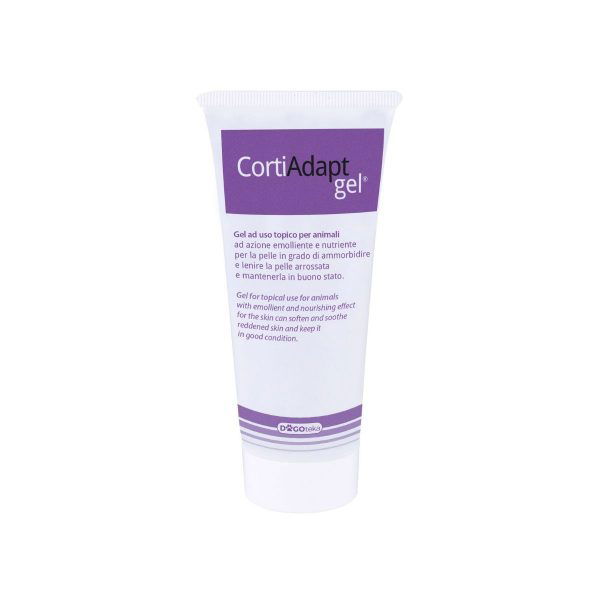 CortiAdapt® je gel s omekšavajućim i hranjivim učinkom za pseću kožu, koji smiruje crvenilo i održava kožu u dobrom stanju. Pogodan je kako za pse tako i za mačke, za topikalnu upotrebu. Pripremljen je s ekstraktom aloje, koja vlaži, hrasta, koji djeluje adstringentno, i laktoferinom, koji potiče zdravo funkcioniranje kože i njezinu elastičnost. Pažljivo izabrana zaštitna i njegujuća formula dezinficira i izvrstan je dodatak svakoj prvoj pomoći. Gel je neophodan dodatak pri liječenju stanja kože koja su karakterizirana svrbežom, crvenilom i promjenama hidrolipidnoga sloja.