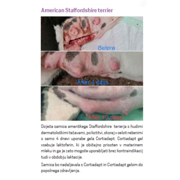 Gel može pomoći nakon uklanjanja šavova, također nakon carskog reza, jer sprječava svrbež i iritaciju. Mogu ga koristiti i dojilje, jer nema opasnosti čak ni ako ga psi unesu. Gel CortiAdapt za lokalnu upotrebu ne sadrži aktivne tvari s toksičnim stupnjem, posebno u tako ograničenim količinama, podsjetimo da sadrži laktoferin glikoprotein, koji proizvodi mliječna žlijezda sisavaca i stoga je prisutan u majčinom mlijeku i mlijeku životinja. Njegova glavna uloga je kolonizacija sluznica sisavaca kako bi bile bolje zaštićene. Laktoferin je glavna zaštita od bakterijskih i virusnih infekcija kod mladunaca jer može potaknuti imunološki odgovor kod tih mladunaca.