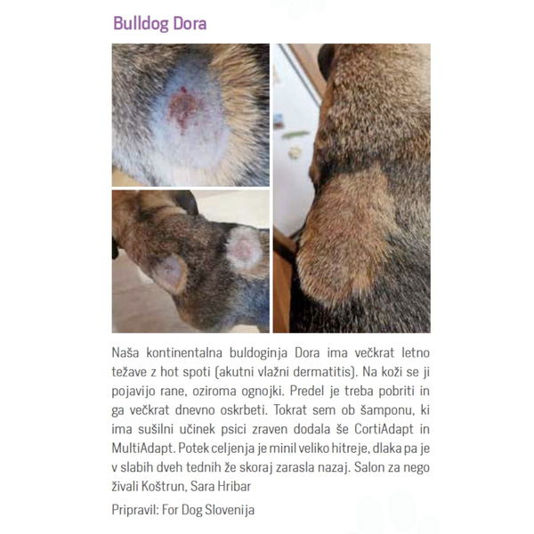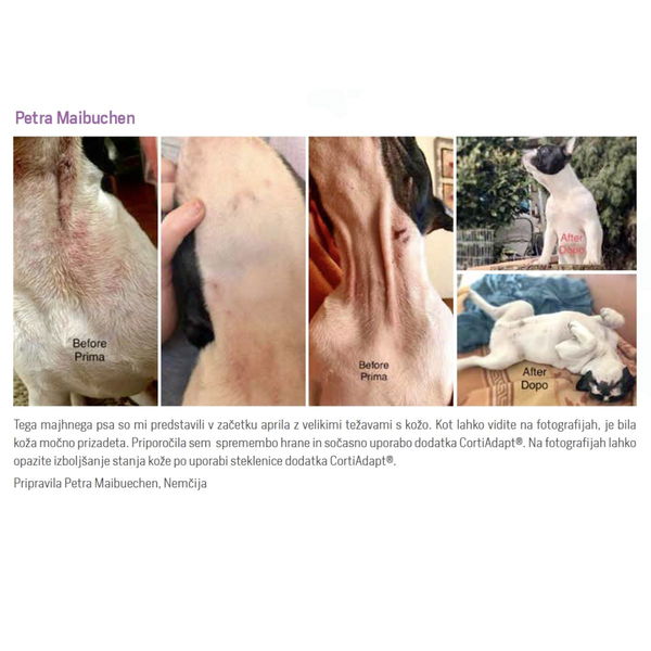 CortiAdapt je prirodni dodatak prehrani koji jača pseću kožu, vraća joj elastičnost i poboljšava izgled dlake pasa. Zahvaljujući rafiniranom ulju crnog ribiza, prahu divlje ljubice i sjemenkama crnog kima također potiče funkciju imunološkog sustava. Redovitim uzimanjem se ojačava epiderma i njezina zaštitna funkcija. Zbog blagih sastojaka, također je primjerena za štence. U tekućem je obliku, tako da se lako dozira. U CortiAdapt® je više aktivnih sastojaka, kao što su crni ribiz, Nigella sativa i Viola tricolor, koji proizvode sinergijski učinak, čime se osigurava učinkovitost proizvoda, koja nije usporediva s unosom samo jedne komponente.