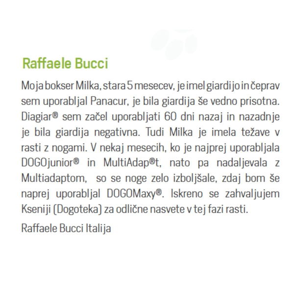 Tablete DiaGiar® sadrže mješavinu eteričnih ulja i drugih prirodnih sastojaka koji održavaju fiziološko zdravlje crijeva. Imaju antiseptički, antidispeptički i antioksidativni učinak na probavni sustav. Kada se pojavi infekcija giardijom, dodatak DiaGiar® uzima se zajedno s lijekom sve dok simptomi ne nestanu. U slučaju korištenja bez lijeka, liječenje će biti duže, čak i do nekoliko mjeseci. Preventivno se preporučuje ciklično dodavanje DiaGiar®, posebice u područjima s visokim prisustvom giardije i u proljetno-ljetnim periodima.