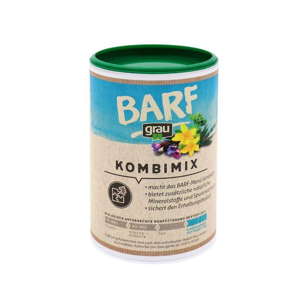 KOMBIMIX je prirodni dodatak prehrani uz sirovo meso, odnosno BARF prehrani. BARF ili ˝Biologically Appropriate Raw Food˝, što znači Biološki primjerena sirova hrana. Svakodnevno ga dodajte obroku psa kako biste osigurali da ne dođe do nedostatka bilo kojeg vitamina, minerala ili drugih tvari.