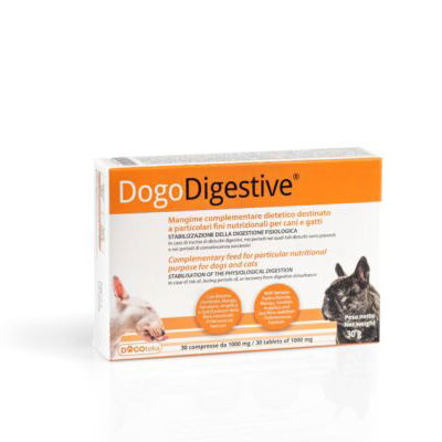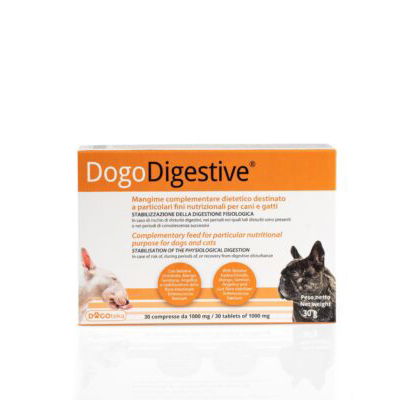 Probavna faza kod pasa je složen proces u kojem organi moraju biti usklađeni, zbog čega sam proces probave zahtjeva više sati (prosječno od 24-36h). DogoDigestive sadrži aktivne sastojke i karminativne biljke s probavnim, antispazmodičkim, enzimskim i eupeptičkim djelovanjem (gorki aktivni sastojci povoljno utječu na izlučivanje želučanih sokova).