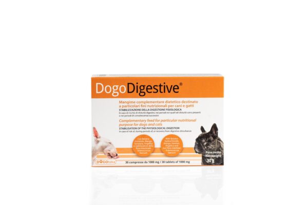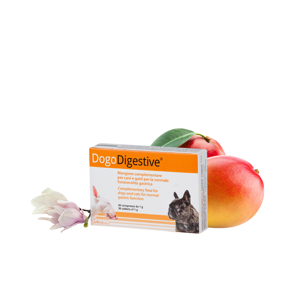 DogoDigestive je inovativni dodatak prehrani za pse u obliku ukusnih tableta. Sadrže magnoliju, anis, betain hidroklorid, mango, encijan i ljekoviti anđeliku (Angelica Archangelica), koji zajedno potiču normalno funkcioniranje probavnog trakta. Na temelju pravih sastojaka koji djeluju sinergistički podržat će probavni proces u svim fazama naših pasa.