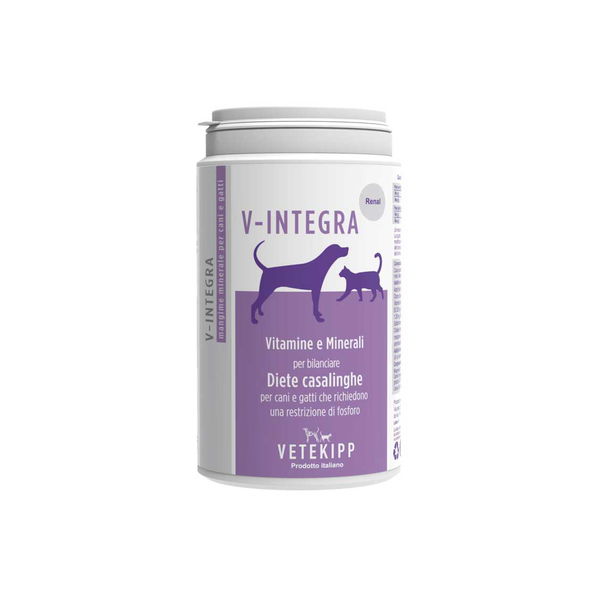 V-Integra RENAL s MANJE FOSFORA i NATRIJA je dopunska vitaminsko-mineralna mješavina u prahu koja se koristi za dopunu domaće pripremljene kuhane ili sirove hrane za pse, s zahtjevima za nižim unosom fosfora i natrija. Obogaćena je antioksidansima, vitaminom C i E.