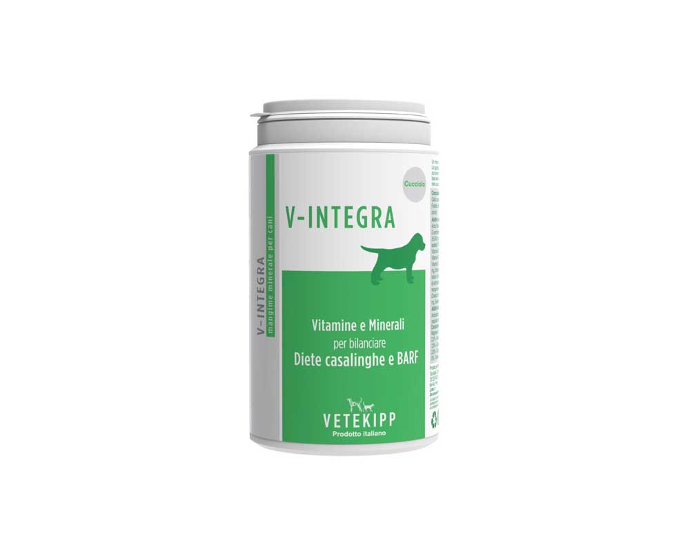 V-Integra CUCCIOLO je dopunska vitaminsko-mineralna mješavina u prahu, razvijena na veterinarskom fakultetu u Padovi, koja se koristi za dopunu domaće pripremljene kuhane ili sirove hrane za štence (do 1. godine starosti) svih veličina. Sadrži optimalan omjer između kalcija i fosfora i obogaćena je mineralima važnima za pravilan rast štenca.