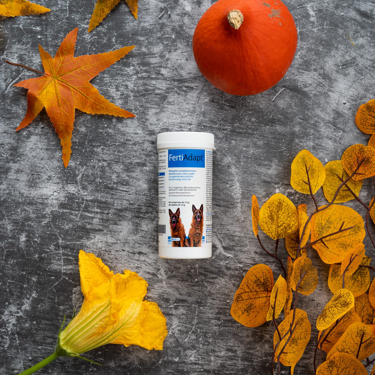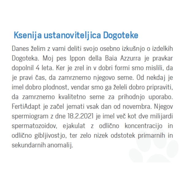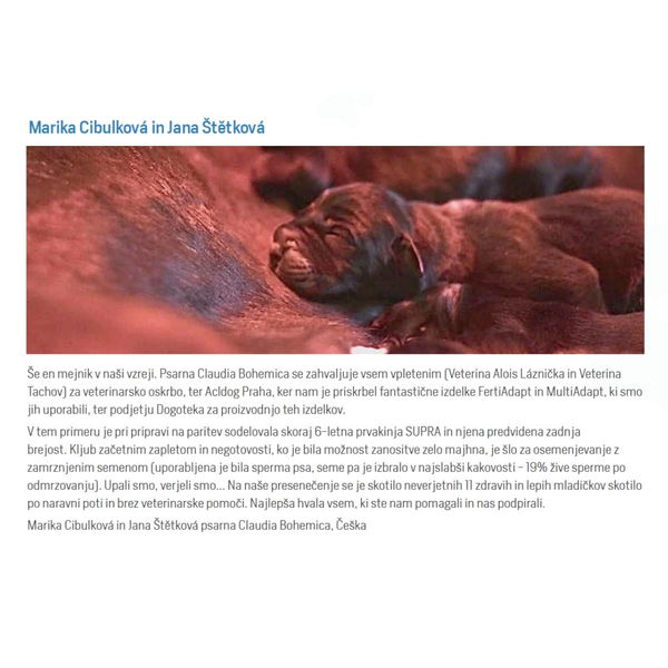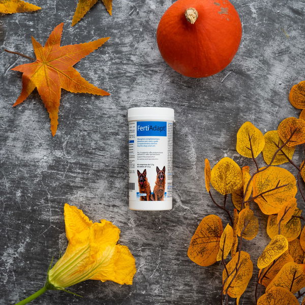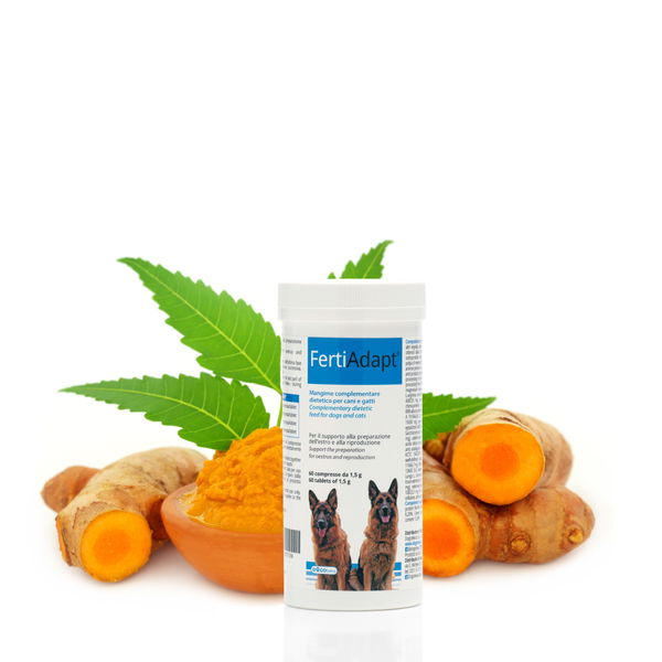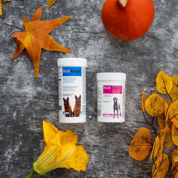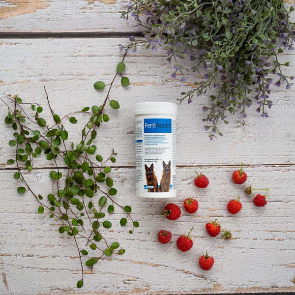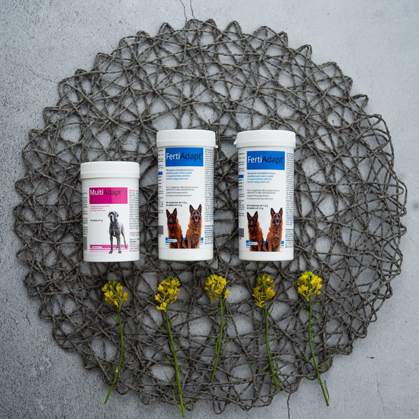 Zbog lošijeg iskorištenja hranjivih tvari iz prehrane ili genetske sklonosti, nekim uzgajivačima se često događa da su mužjak ili ženka slabije plodni. Predstavljamo rješenje! FertiAdapt® je dodatna mješavina hrane za podršku pripremi estrusa kod kuja i razmnožavanje. Koristi se kako za mužjake tako i za ženke; za mužjake preporučujemo primjenu 2 mjeseca prije parenja, a kod ženki najmanje 4 mjeseca prije tjeranja. Zbog sadržaja selena i cinka pomaže kod plodnosti oba spola, jer oba pomažu metabolizmu hormona štitnjače. Nedostatak cinka može dovesti do smanjenja plodnosti kod ženki jer je ključan za sintezu estrogena i progesterona.