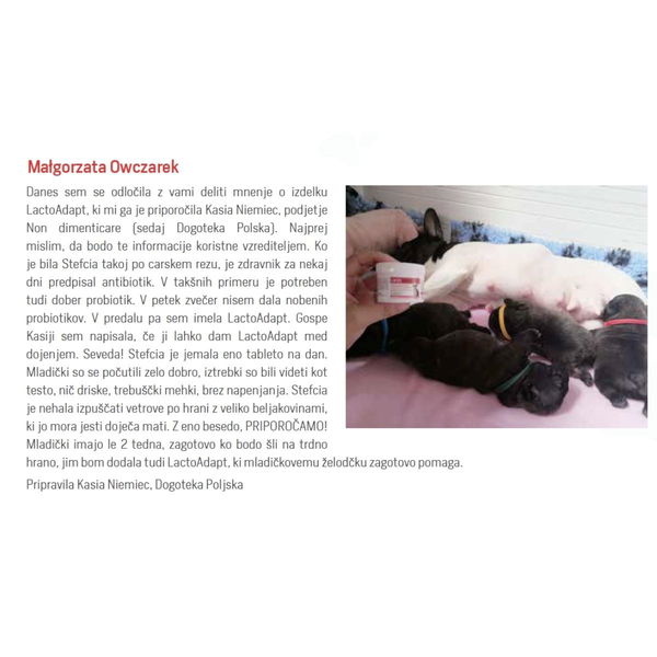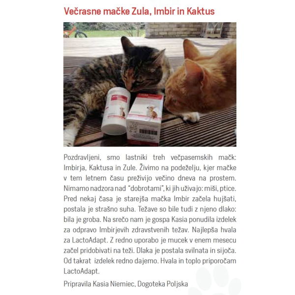 Dodatak prehrani LactoAdapt® sadrži aktivne sastojke koji uspostavljaju ravnotežu crijevne mikroflore. Preporučuje se kod proljeva i zatvora, te preventivno prije stresnih događaja, poput posjeta veterinaru, duljeg putovanja automobilom ili promjene hrane. Možete ga ponuditi i skotnim i dojiljama, kako bi majka i njezini štenci izbjegli probavne smetnje.