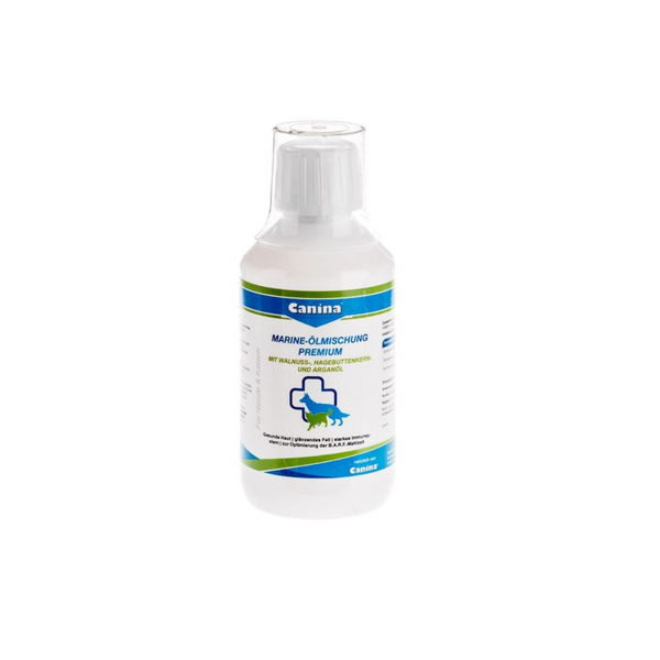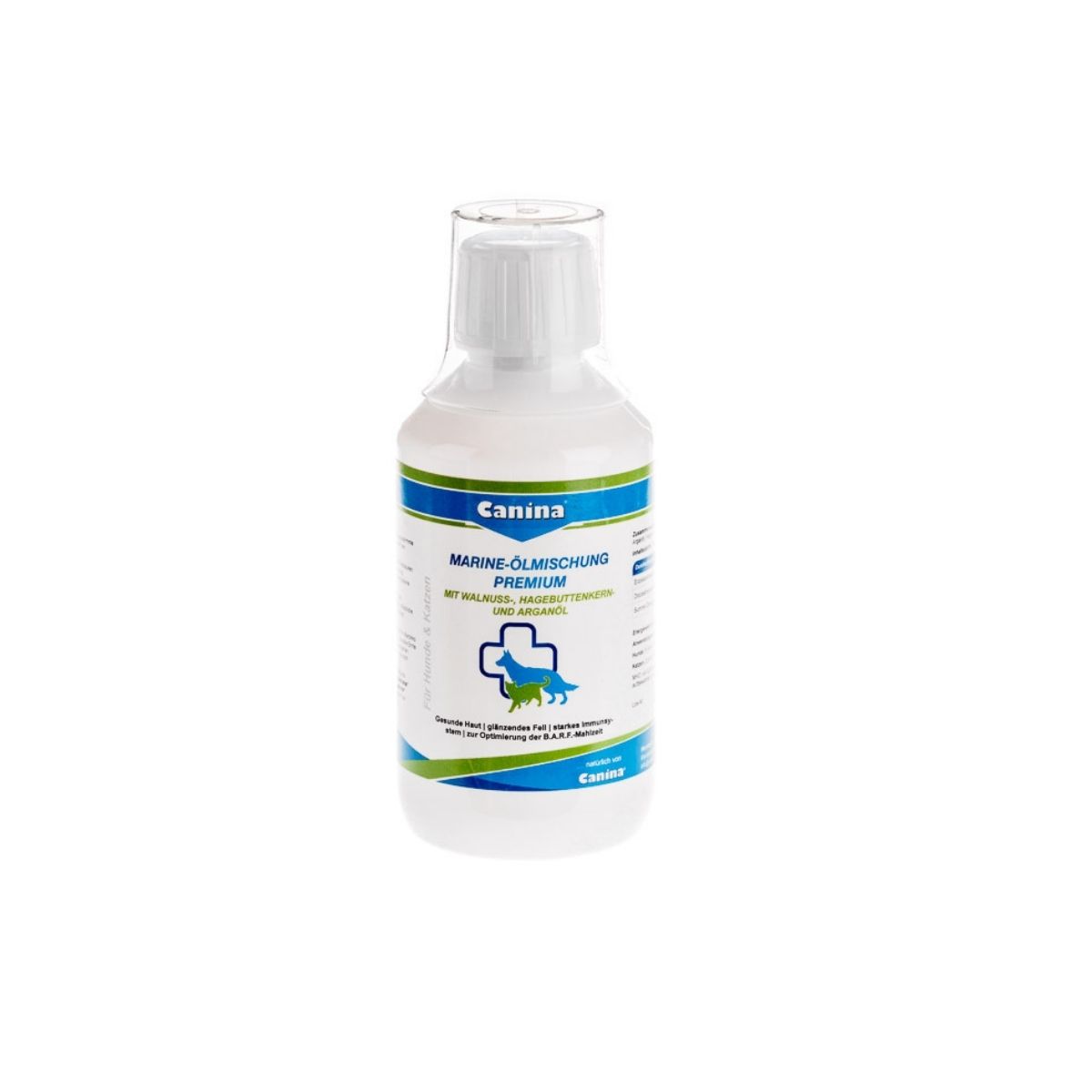Mješavina ulja Marine Premium sadrži riblje, orahovo, šipkovo i arganovo ulje. Radi se o posebno odabranoj kompoziciji ulja koja se međusobno nadopunjuju te blagotvorno djeluju na organizam. U sinergijskom djelovanju brinu za sjajnu dlaku, zdravu pseću kožu, jak imunski sustav i zdravu probavu. Sve što želimo za našeg psa!