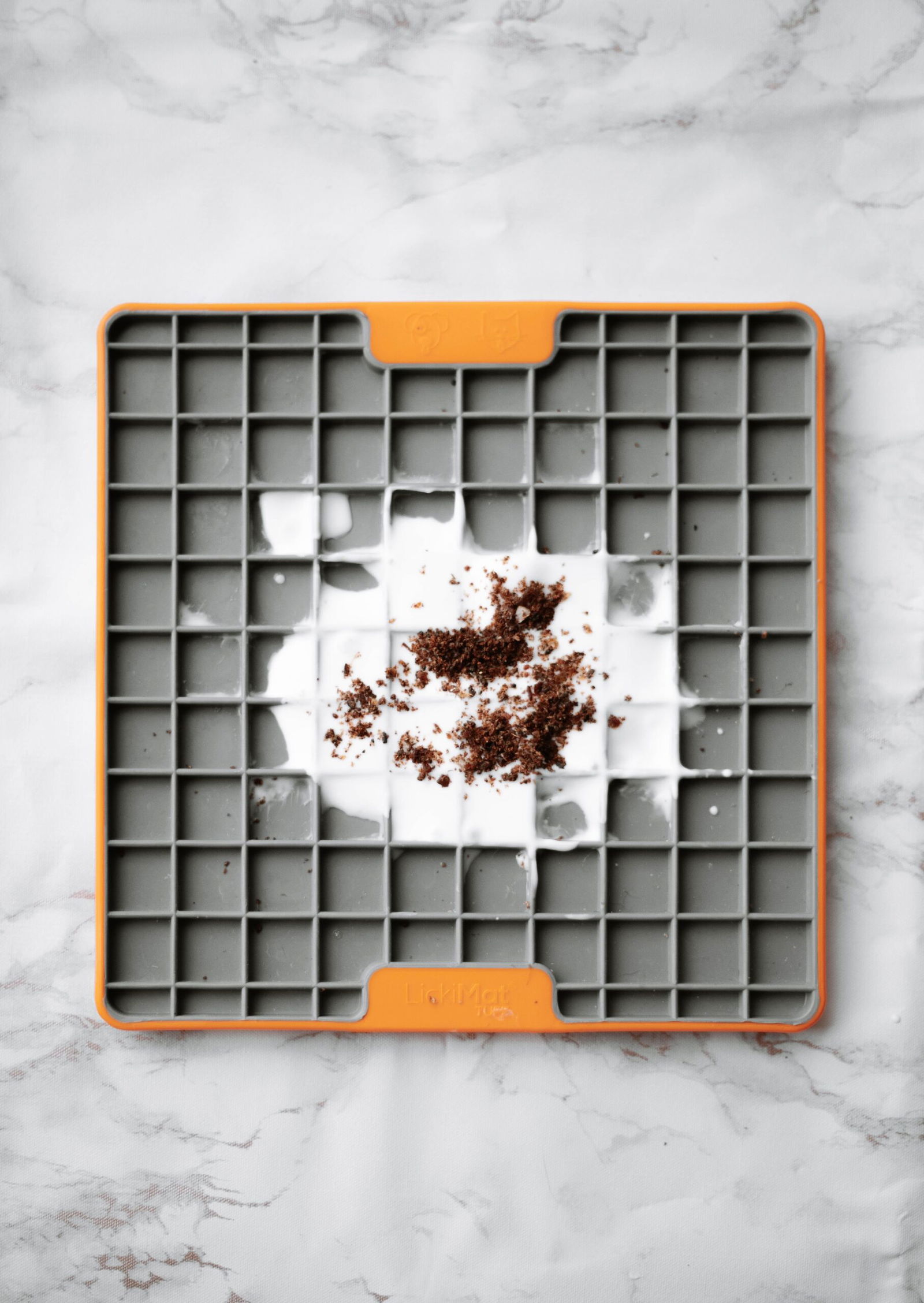 Na LickiMat ili zdjelu za sporo hranjenje izlijte "tekuću" osnovu te preko dodajte posip od zelenousnih školjki. Za dužu zabavu i/ili hlađenje u vrućim danima mediteransku užinu prvo zamrznite. Dobar tek! ;)