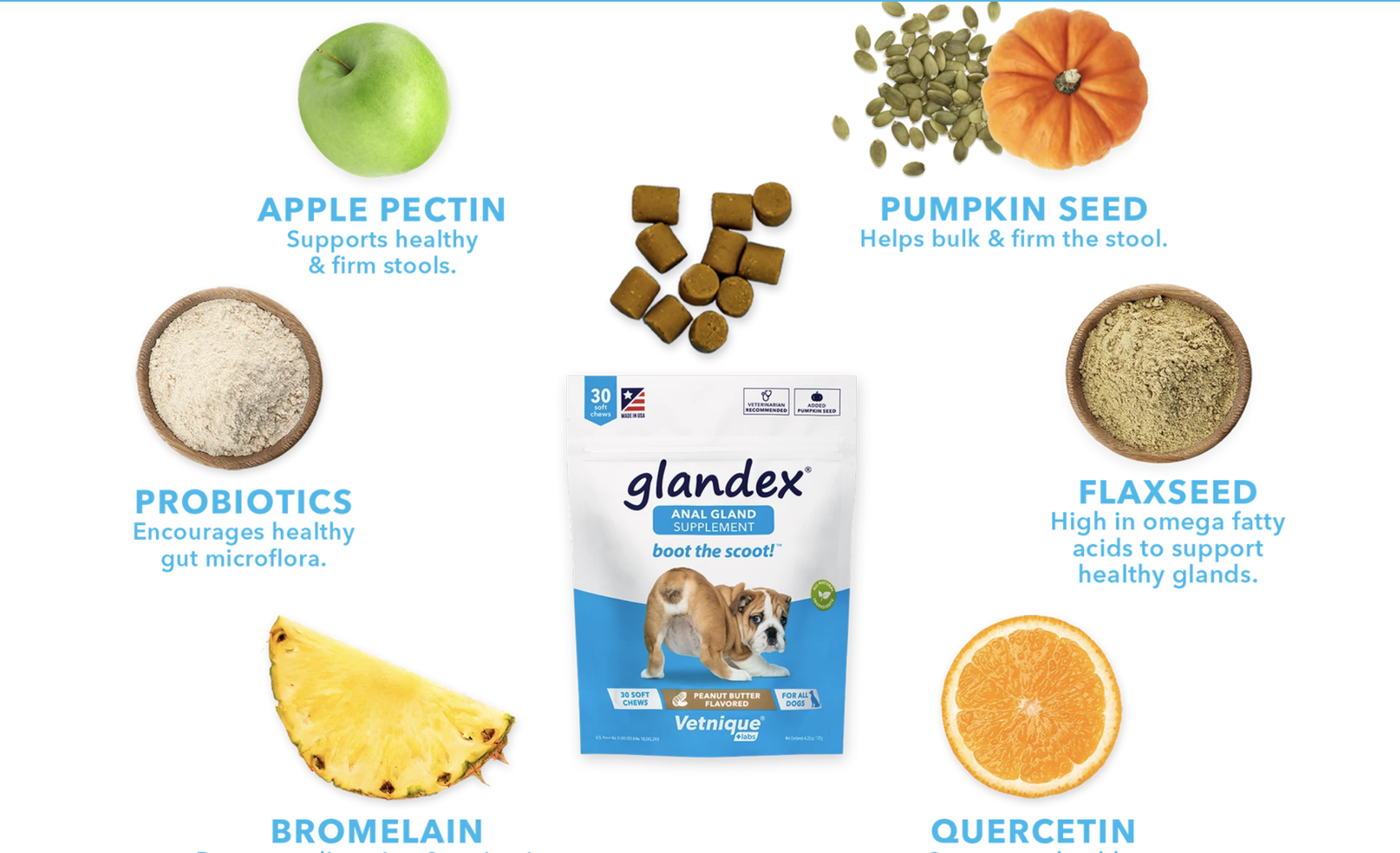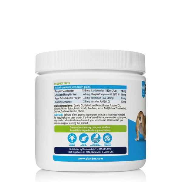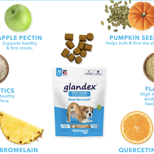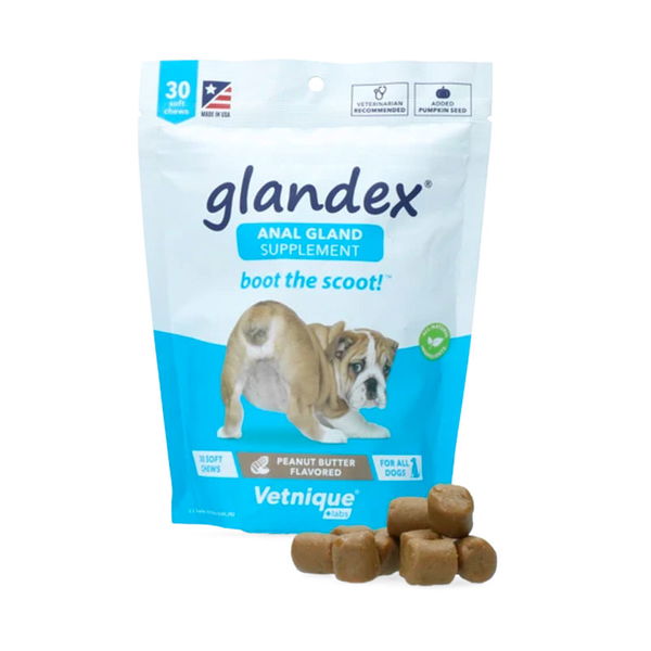 Poslastice za čišćenje analnih žlijezda marke Glandex, osmišljene su posebno za rješavanje i prevenciju začepljenih analnih žlijezda. Radi se o popularnim poslasticama koje mnogi vlasnici preventivno daju svojim psima, jer su psima prijateljske i ugodne za doziranje. Imaju pozitivan učinak na prirodan proces čišćenja analnih žlijezda i imaju aromu maslaca od kikirikija, koji psi obožavaju. Podržavaju probavu i crijevnu floru probavnog trakta te na taj način prirodno potiču proces čišćenja analnih žlijezda.