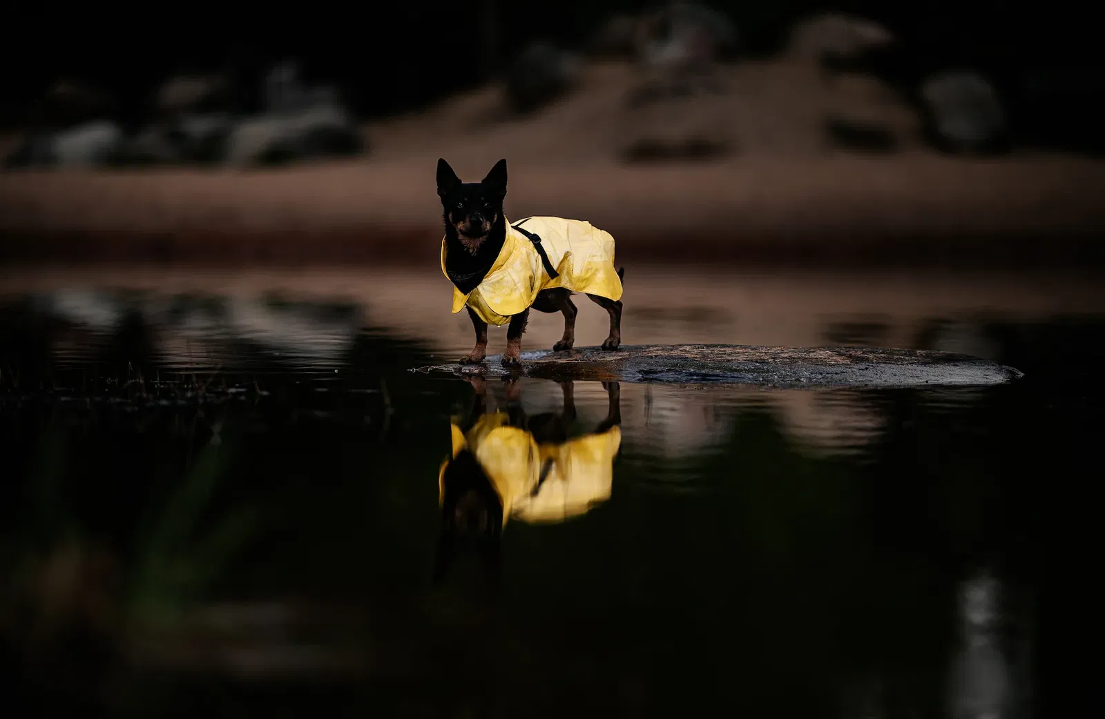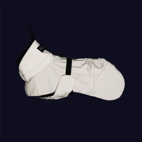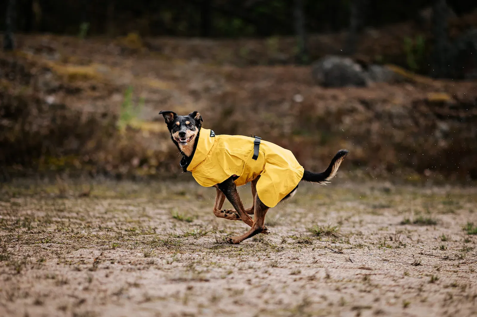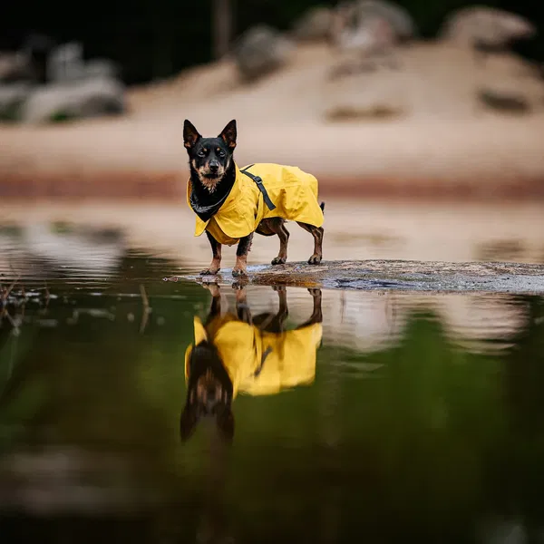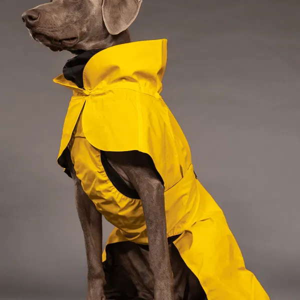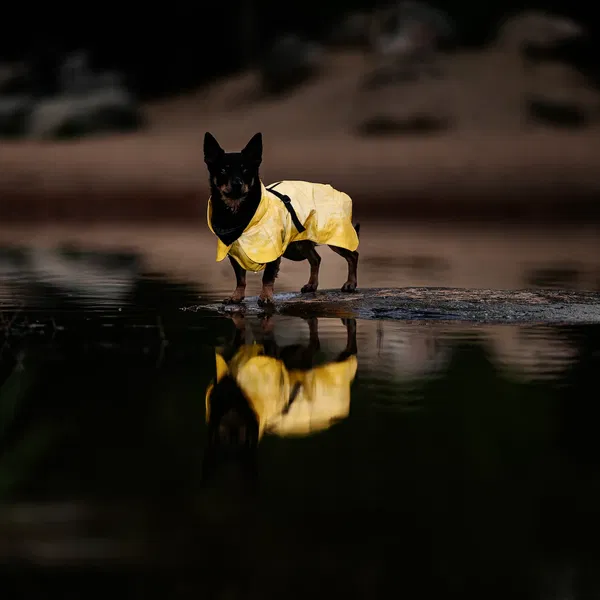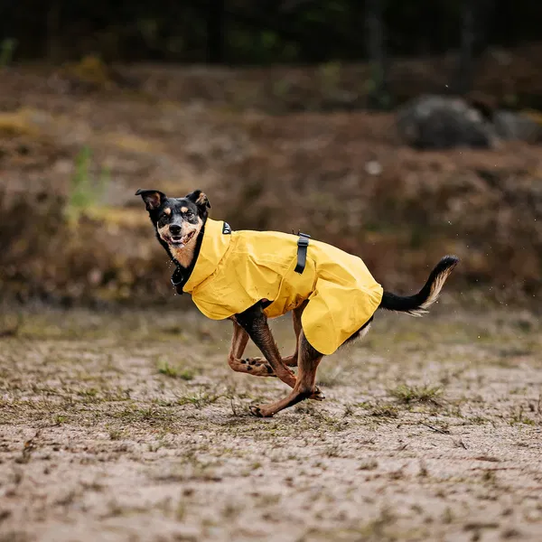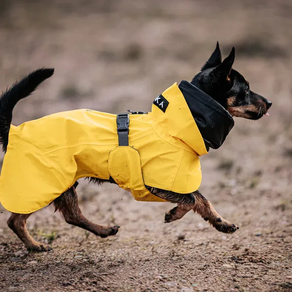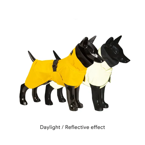 Najbolji kišni ogrtač za pse; jakna, koja je u potpunosti reflektirajuća, nepropusna, s otvorom za ormu na patentni zatvarač i prorezom kod repa, kako ne bi ograničavala kretanje repa, što može negativno utjecati i sprječavati psa da komunicira s drugim psima kada je obučen. Istovremeno, ovaj kišni ogrtač za pse dizajniran je tako da u potpunosti pokriva prsni koš sa prilagodljivim remenom na kopču, a kroj straga doseže gotovo do koljena, kako bi pokrio cijelu dlaku i bedra čak i tijekom kretanja.