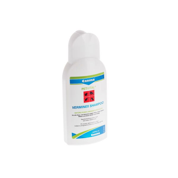 Šampon protiv parazita Verminex je pH neutralan, hidratantan i nježan prema psećoj koži. Djeluje protiv buha, ušiju, krpelja, grinja, njihovih ličinki i jaja. Dodatni bonus je da djeluje i repelentno nakon primjene. Ovaj iznimno učinkovit šampon uklanja neugodne mirise i istovremeno njeguje dlaku. Nema dodane parfeme i sadrži dodekanoičnu kiselinu i ekstrakt sjemena neema (ekstrakt margosa).