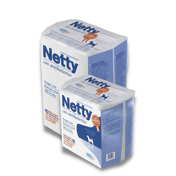 Upijajuće podloge Netty su samoljepljive podloge koje će ostati na svom mjestu i neće kliziti po podu. Prikladne su za učenje unutarnje čistoće štenaca, a također su izvrsna podrška starijim psima koji imaju probleme s zadržavanjem urina (inkontinenciju). Na taj način pružaju pomoć u rješavanju higijenskih problema pasa svih veličina i starosti. Posebno su popularne kod uzgajivača kao podloga u kućici za okot te praktična i iznimno upijajuća podloga za pse u vrijeme rehabilitacije.
