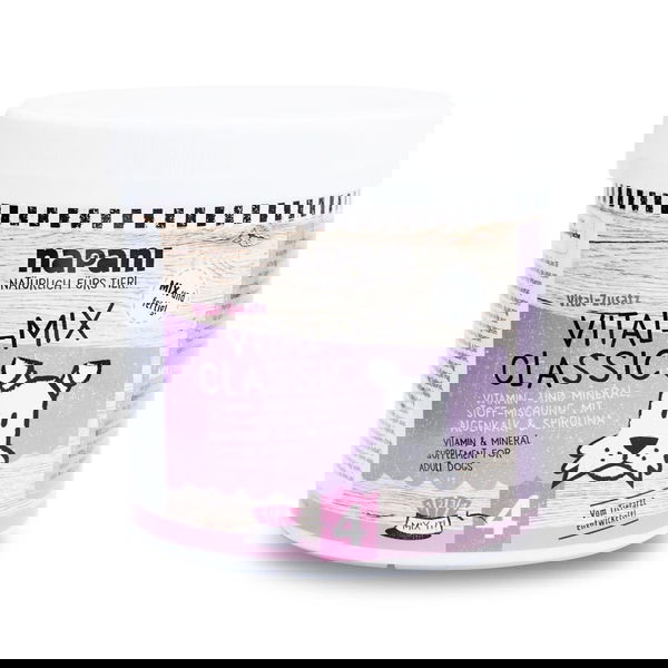 Mješavina Vital-Mix Classic psima osigurava važne minerale i vitamine za dobrobit i jačanje imunološkog sustava. U kombinaciji s čistim mesom i/ili pripremljenim menijima iste marke Napani, pobrinut ćete se za odgovarajući i preporučeni unos mikronutrijenata, elemenata u tragovima, vitamina i minerala. Ova mješavina prikladna je za zadovoljenje potreba za vitaminima i mineralima u slučaju da pripremate obroke kod kuće (kuhane ili BARF) te u slučaju različitih propisanih dijeta, preporučenih od strane veterinara/nutricionista za pse iz zdravstvenih razloga (dijeta s niskim sadržajem purina, vegetarijanske ili veganske dijete, itd.).